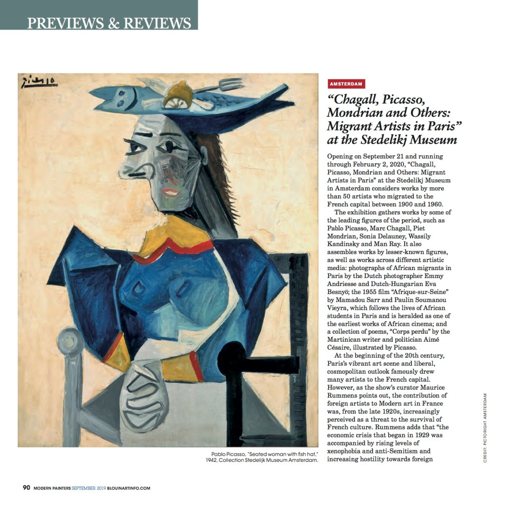 daisysainsbury September 1, 2019 Art, Home Preview: “Chagall, Picasso, Mondrian and Others: Migrant Artists in Paris” at the Stedelikj Museum Full article in Modern Painters magazine (September 2019).